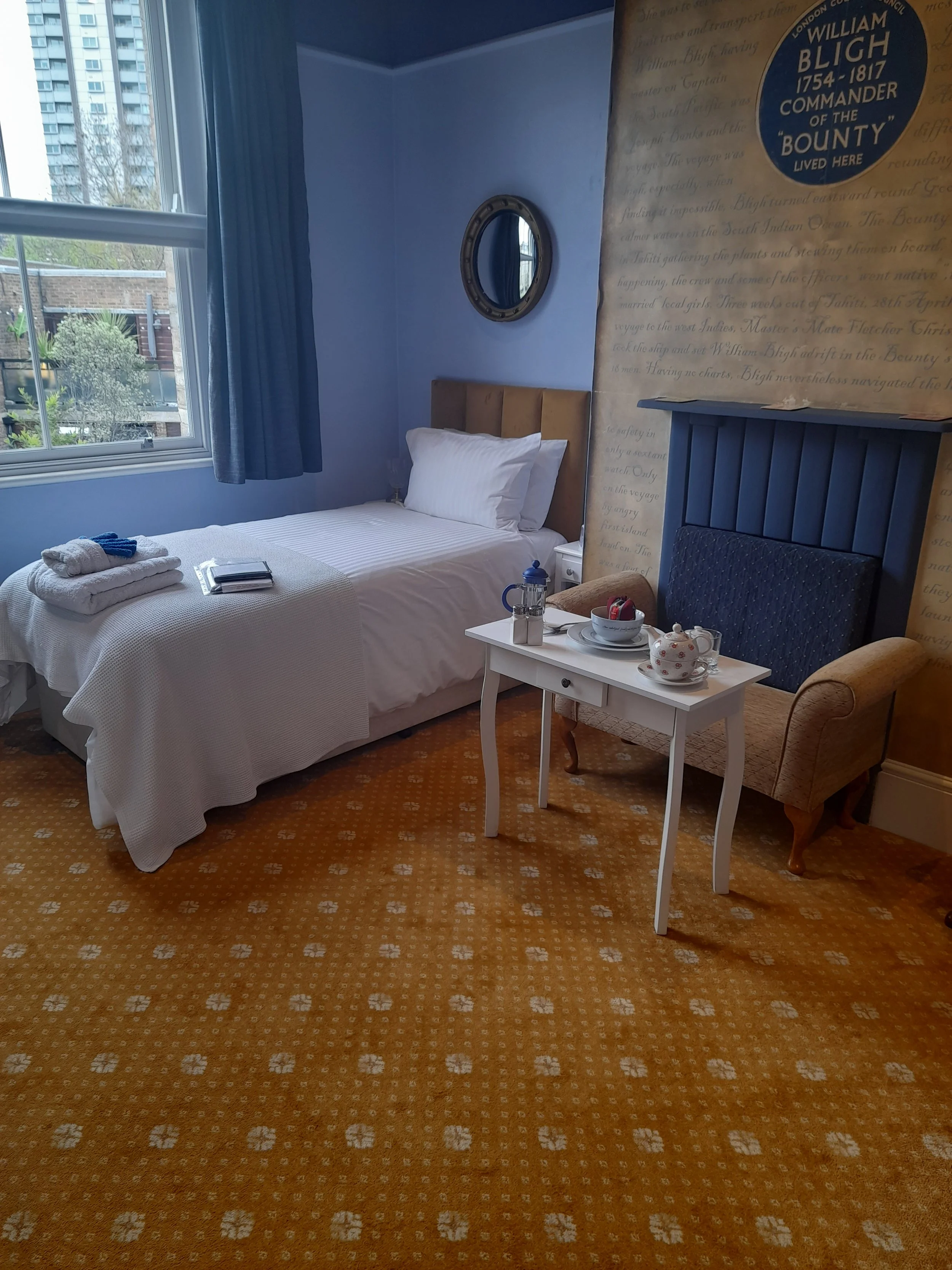 The Captain’s Cabin is a quiet, single, studio bedsitting room overlooking the back garden on the mezzanine between first and second floors.