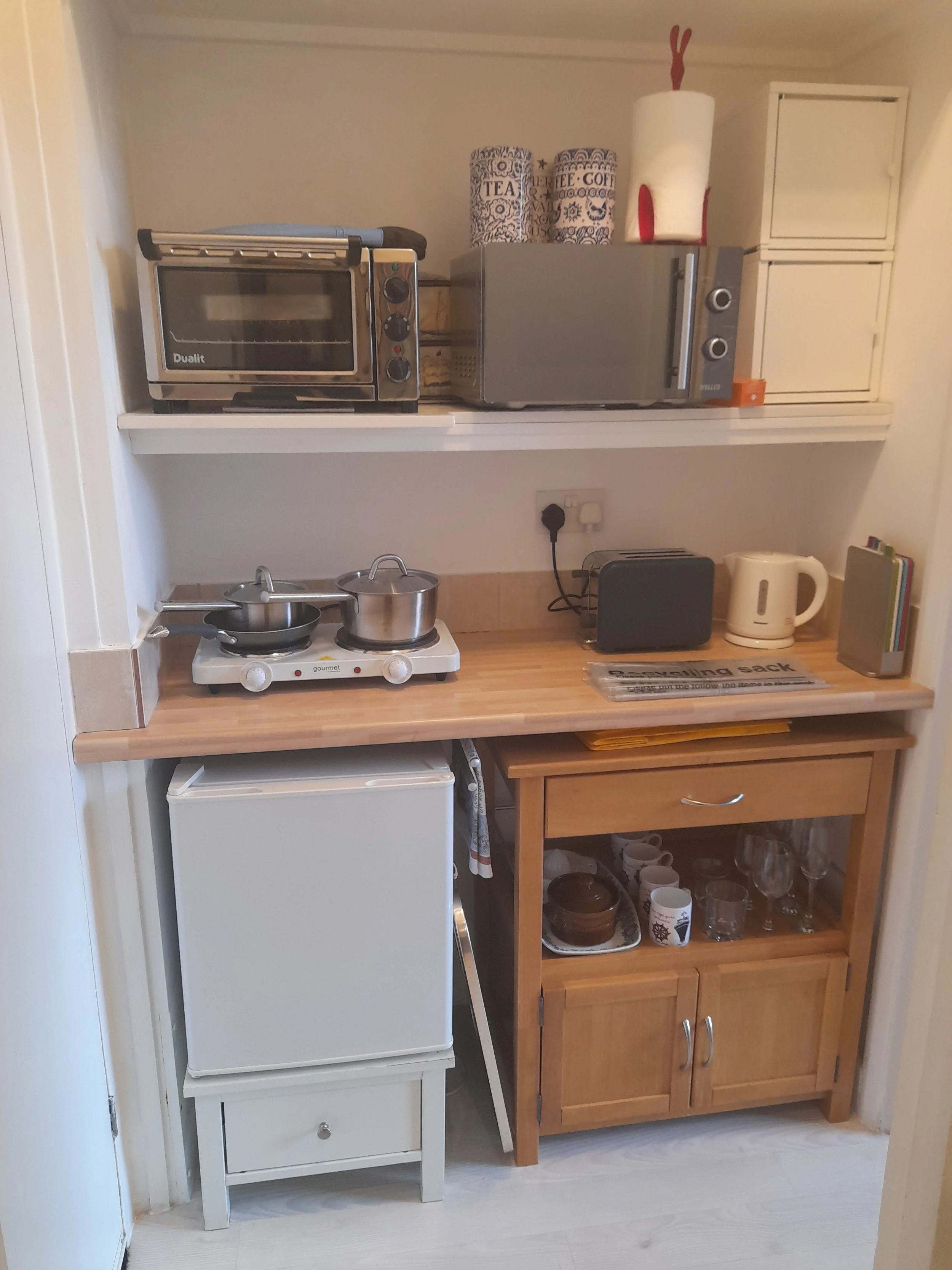 It is decorated in suitably nautical theme. Its little kitchenette has all your breakfast provisions waiting for you (see FAQs), a table set ready, and a small seating area to relax in. There is a 3 foot single bed. It also has en-suite loo and shower.